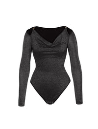 This sculpting bodysuit blends high fashion with hidden shaping power, featuring shimmering metallic fabric that catches the light and a built-in mesh layer that smooths and supports your silhouette.