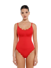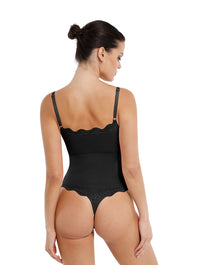 Lace Trim Details: Romantic lace accents frame the round neckline and leg openings, adding a touch of femininity and sensual charm to this one-piece shapewear design.
