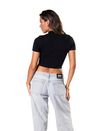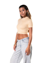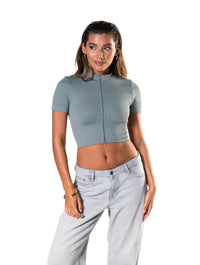Top curto sem costura canelado com zíper frontal e manga curta