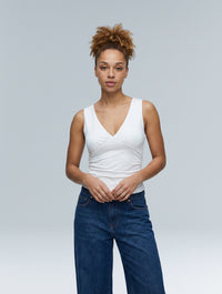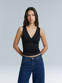 Soft gathers at the bust and sides create a naturally contoured, feminine look.